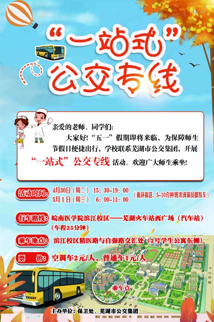 为持续巩固深化学习贯彻习近平新时代中国特色社会主义思想主题教育成果,扎实开展“我为群众办实事”实践活动,推进“幸福皖医行动”,学校经与芜湖市公交集团联系,将在“五一”假日期间开展“一站式”公交专线乘车服务活动,保障师生节假日便捷出行。现将有关事项通知如下: